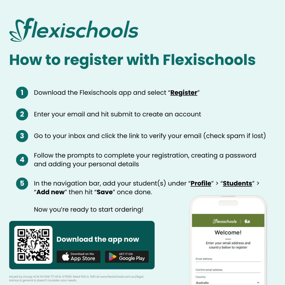 Below is information about how to register with Flexischools and how to place a lunch order online.